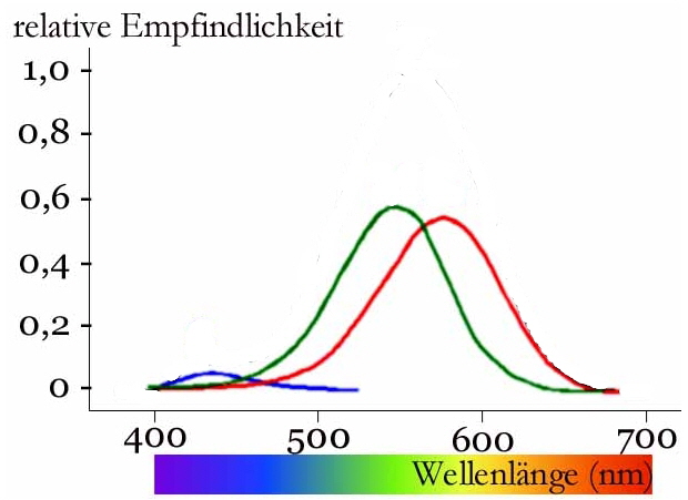 Unser Auge nimmt Farbe durch drei Sorten Sinneszellen, den Stäbchen wahr. Diese nehmen jeweils die Anteile blauen, roten und grünen Lichtes wahr..